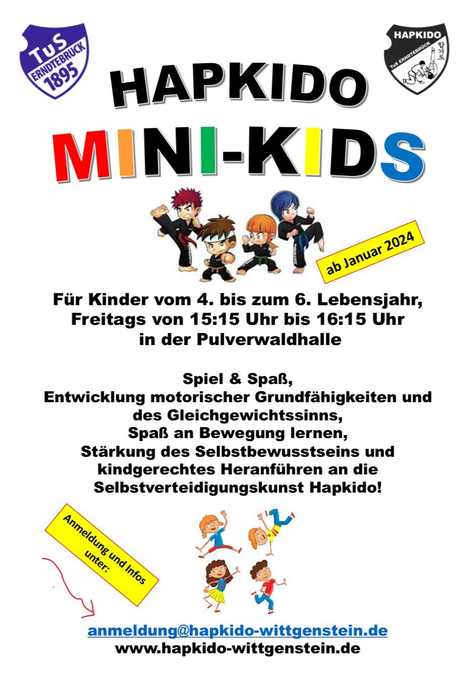 Der Schwerpunkt dieser vereinsinternen Prüfung liegt bewusst auf der frühsportlichen Förderung. Dabei stehen vor allem die koordinativen und motorischen Fähigkeiten der Kinder im Mittelpunkt. Ergänzend dazu werden auch erste Elemente der Selbstverteidigung geübt – weniger im Hinblick auf Technik, sondern vielmehr mit dem Ziel, das Selbstbewusstsein der Kinder zu stärken und ihnen Freude an der Bewegung zu vermitteln.