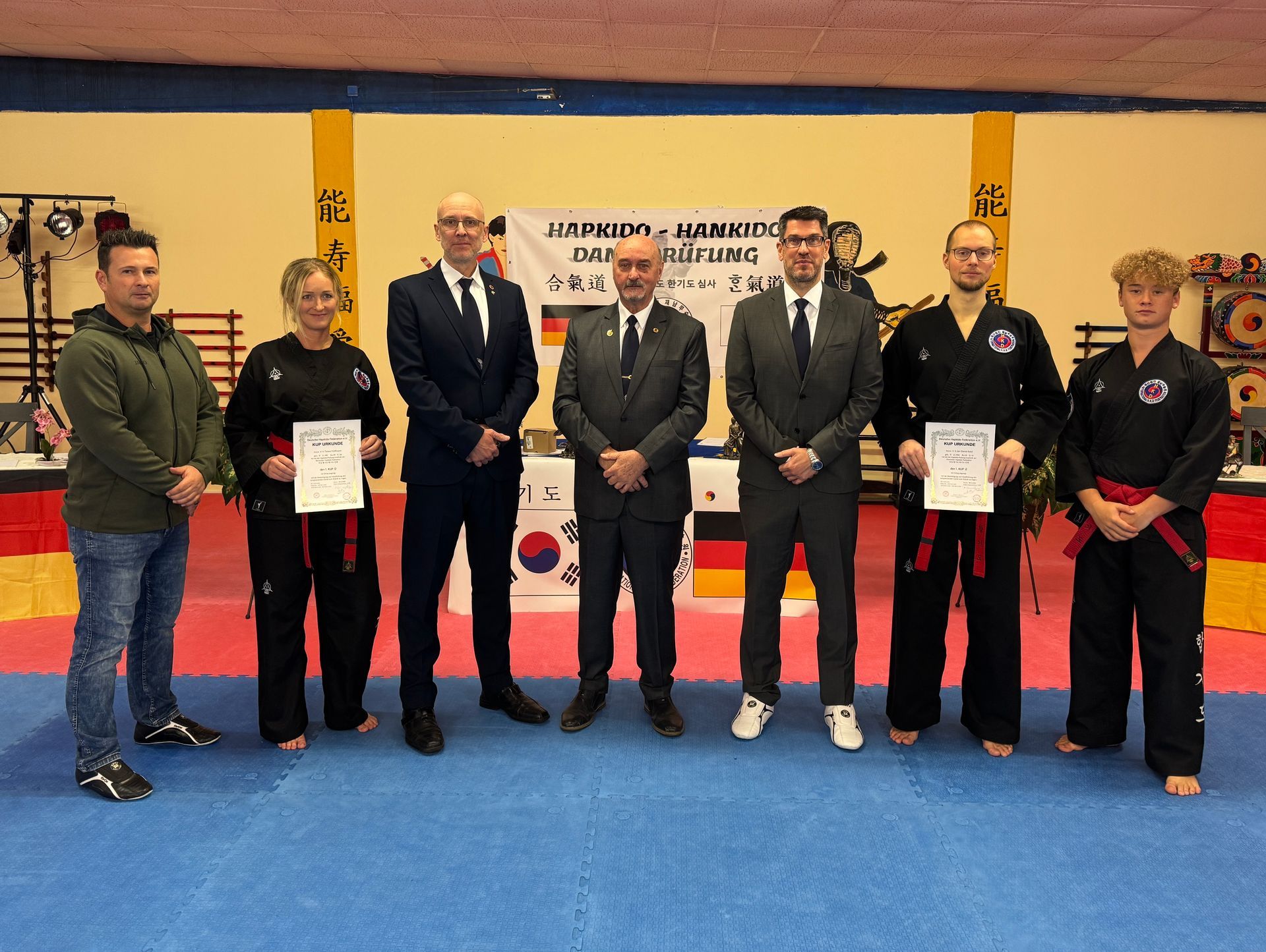 Den Anfang machten 14 Hapkidoin, die in den Bereichen Grundschule, Atemtechniken, Fallschule, Selbstverteidigung, Waffenformen und Bruchtests geprüft wurden. Ein besonderes Augenmerk legte Prüfer Jens Hoffmann (Deutsche Hapkido Federation) auf realitätsnahe Selbstverteidigungsszenarien. Die abschließenden Bruchtests sorgten für staunende Gesichter – eindrucksvolle Techniken und Präzision unter Beweis gestellt!