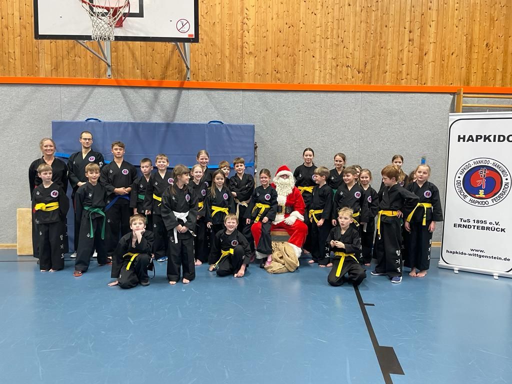 Besonders aufregend wurde es dann als der (echte!) Weihnachtsmann mit einem Sack voller selbst gebastelter Geschenke die Halle betrat. Nachdem diese alle an die glücklichen Kinder verteilt waren lies sich der älteste Mensch in der Halle es sich nicht nehmen mit der Gruppe ein paar Tritte zu üben!