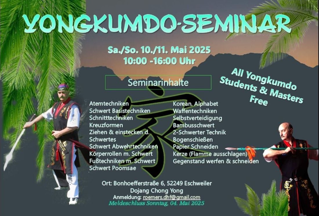 Auf Einladung von Trainer Jens Hoffmann reiste hierfür als Referent Großmeister Josef Römers, 8. Dan Taekwondo, 7. Hapkido, 10. Dan Yongkumdo, mit seinem Assistenten-Team aus Eschweiler an um die von ihm entwickelte Schwertkampfkunst Yongkumdo vorzustellen.
