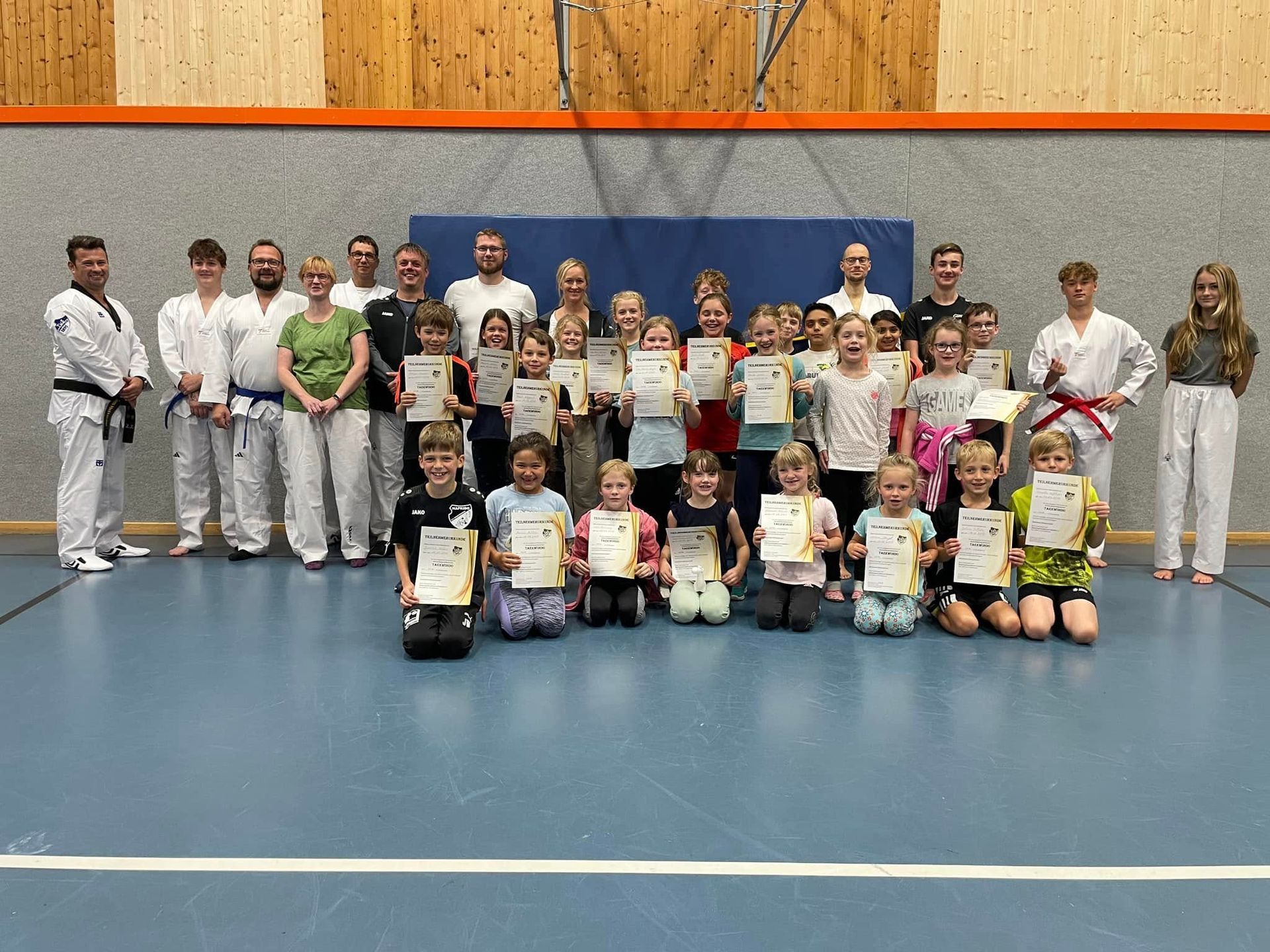 Am Ende durfte sich jede Teilnehmerin und jeder Teilnehmer über die wohlverdiente Urkunde zum nächsten Gürtelgrad freuen. Damit wurde die monatelange Trainingsarbeit belohnt und ein weiterer Schritt auf dem Weg im Taekwondo erfolgreich gemeistert.